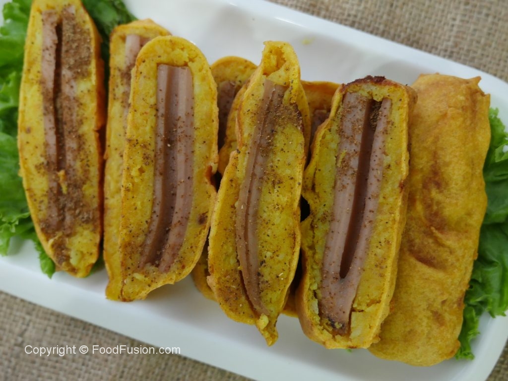 Cut lotus root from the center into two halves and take potato mixture and coat properly on lotus roots & set aside.