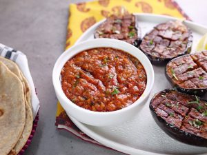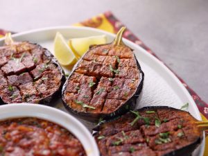 -Cut eggplant into half,make vertically & horizontally cuts & sprinkle prepared spice mix (reserve for later use).