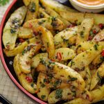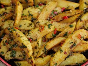 -Peel potatoes & cut in wedges,sprinkle pink salt & mix well.