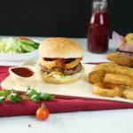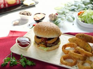 -On a burger bun,add & spread tomato ketchup,add iceberg leaves,beef patty,crispy onion rings,tomato ketchup & cover with top burger bun & serve with prepared crispy onion rings & potato wedges (makes 4).