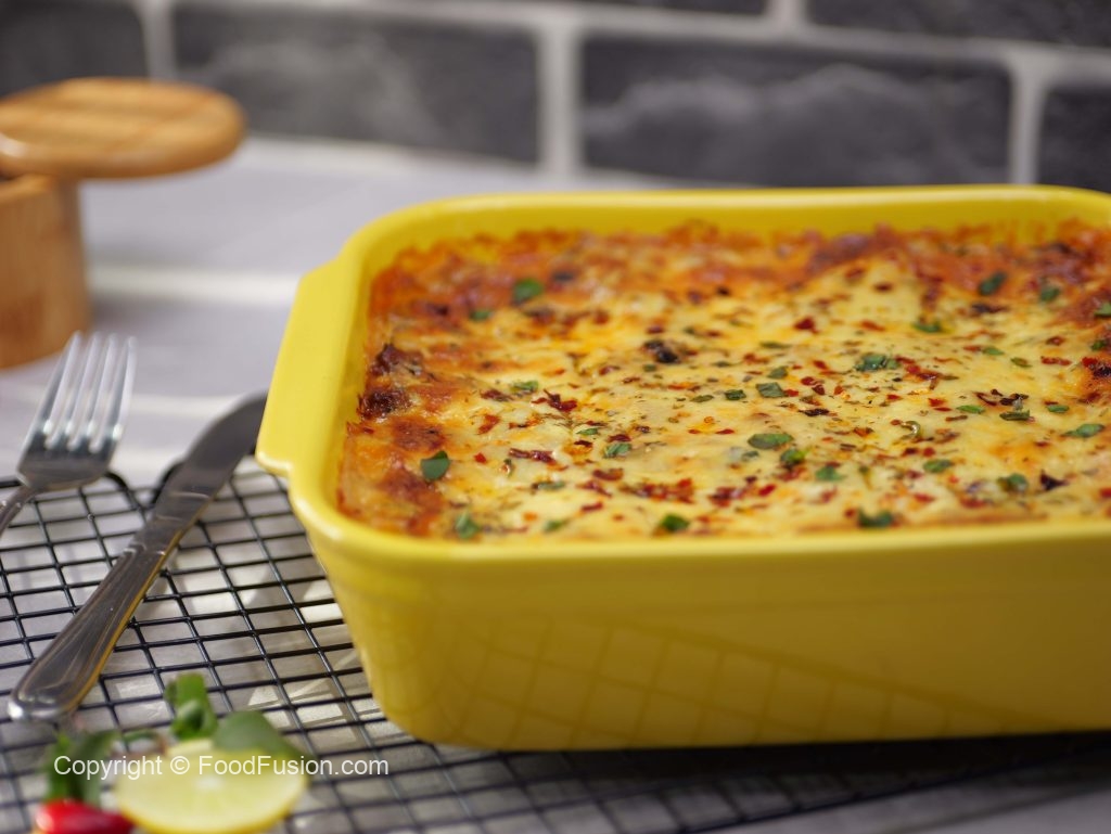 -In a baking dish (9x9 inches),add red sauce,lasagna sheets,red sauce,fresh basil leaves,white sauce & mixed cheese.