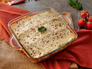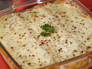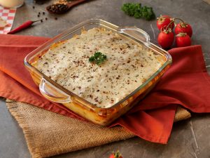 Add lasagna sheets,red sauce,smoky chicken,white sauce,lasagna sheets,red sauce,cheddar cheese,mozzarella cheese,sprinkle dried & red chilli crushed on top.