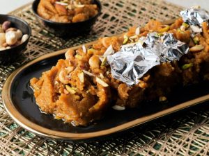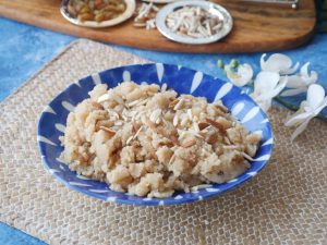 Add ghee (2 tbs at a time),mix well & cook on low flame until it changes color (12-15 minutes) and mix continuously.