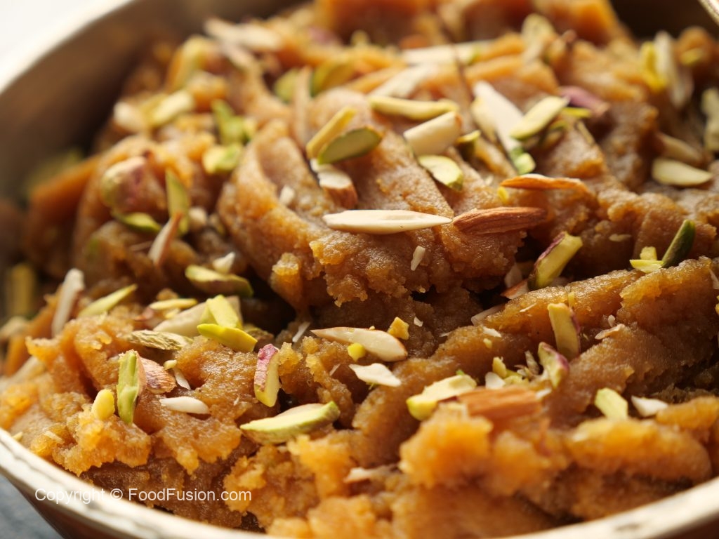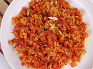 Tayyar sheera dal kar achi tarah milayen aur halki ancch per ek saath ho janay & ghee alag ho janay tak paka lein (8-10 minutes) aur musalsal mix kertay rahein.
