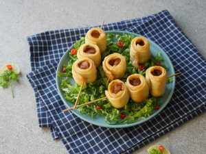 Cut into long strips,take one strip,place one chicken boneless cube and roll it then thread into skewers.