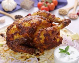 -Do not forget to place the food tray under the chicken & grill at 160°C until chicken is done (60-90 minutes) (Temperature & timings can vary according to your appliance).
