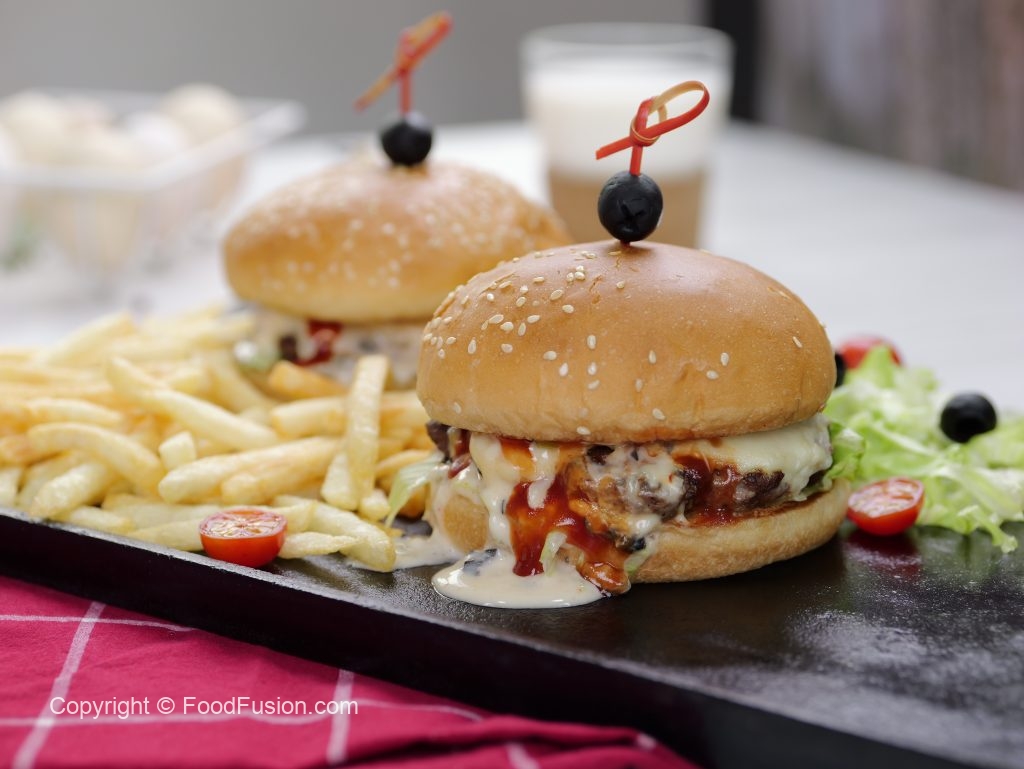-Toasted burger bun per tayyar cheese sauce,iceberg,cooked beef patty with cheese,cheese sauce aur tomato ketchup dal ker upper sa burger bun rakh dein (makes 5).