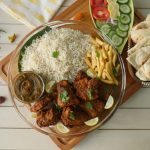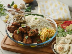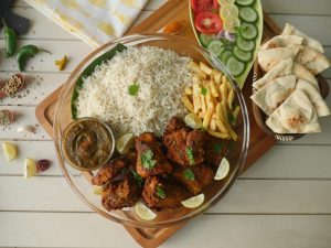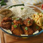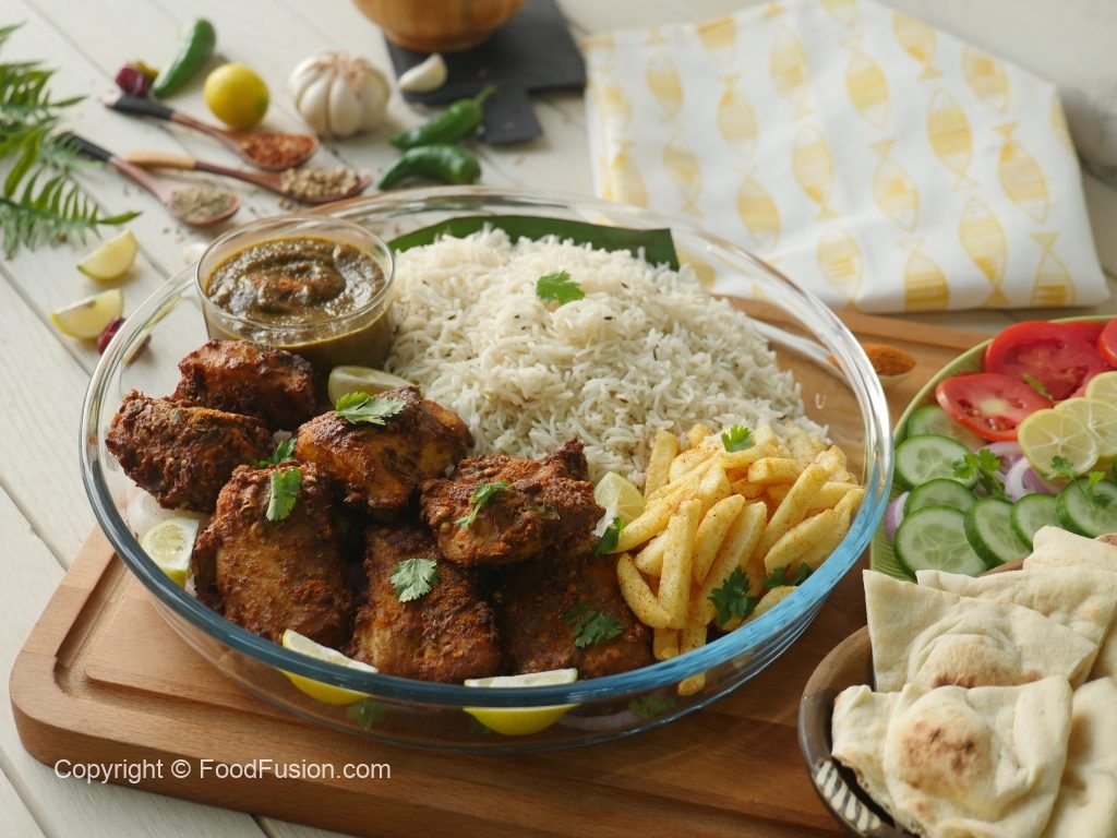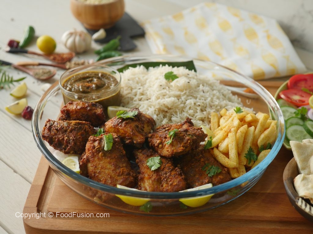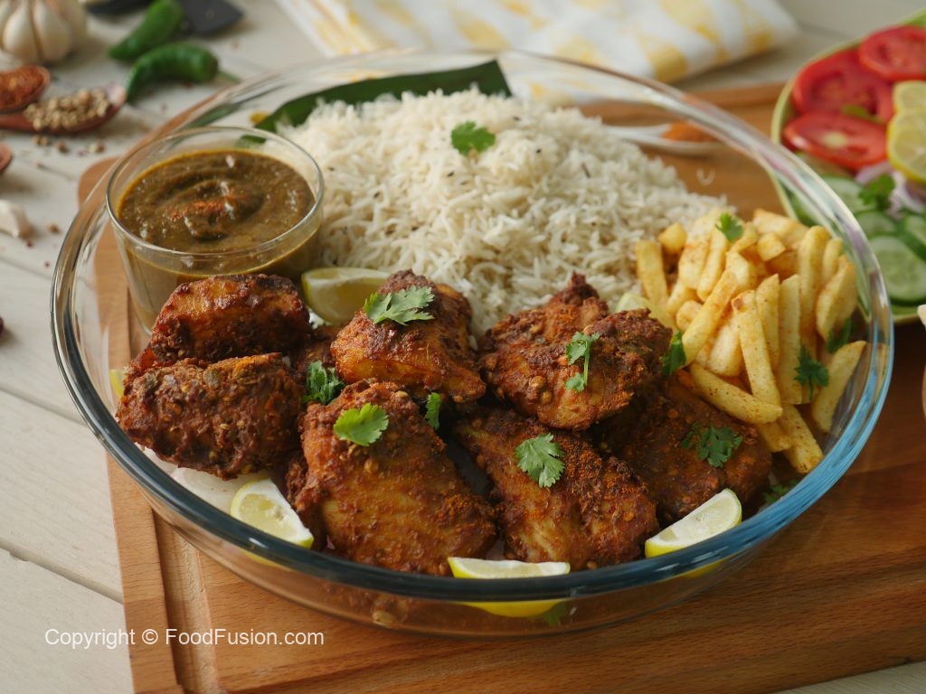 Fried fish ko zeera chawal,potato fries/chips,pyaz rings,imli podina chutney ka saath serve karein.