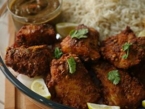 Serve fried fish with zeera rice,potato fries/chips,onion rings and prepared tamarind mint sauce.