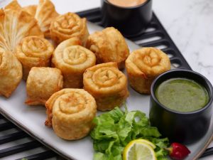 -On roll sheets add prepared filling & spread it evenly along the length,fold & seal with the help of flour slurry then fold it into a pinwheel shape & seal with flour slurry.