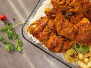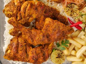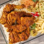 -Serve steam chicken with rice,garlic naan,french fries & tamarind green sauce!