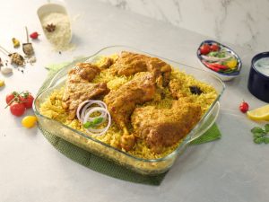 -In a dish,place fried chicken pieces,add prepared marinade,rub evenly & reserve ½ Cup of marinade for pulao,cover with cling film & marinate for 1 hour.