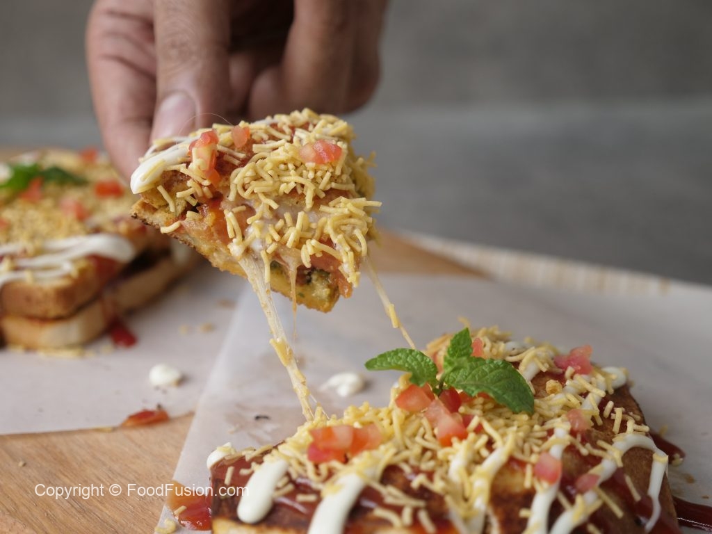 Cut sandwich into four pieces,drizzle tomato ketchup,mayonnaise,sev nimco,tomato & serve!