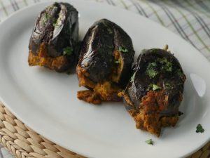In frying pan,add olive oil and place stuffed brinjals,cover and cook on low flame until done (approx. 25-30 minutes) and keep turning sides or flip to cook evenly.