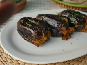 Baigan mein char slit laga lein aur tayyar mixture sa bhar dein.