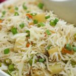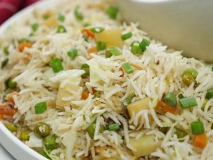 -Chawal,band gobhi,shimla mirch aur hara pyaz leaves dal ker ache tarhan mix karein aur dhak ker halki ancch per 8-10 minutes kliya dum per rakh dein.