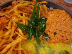 -Serving bowl mein rice, daal, crispy aloo, prepared teekhi chutney, pickle onion aur fried curry leaves dal kar serve karen.