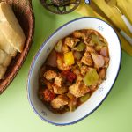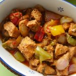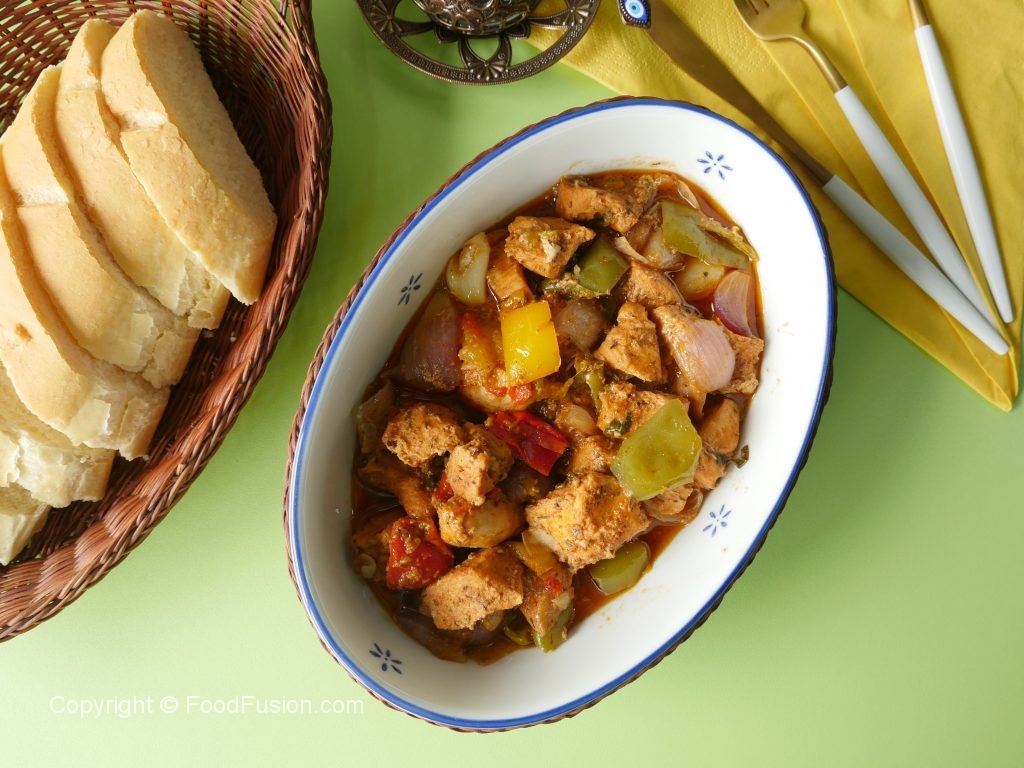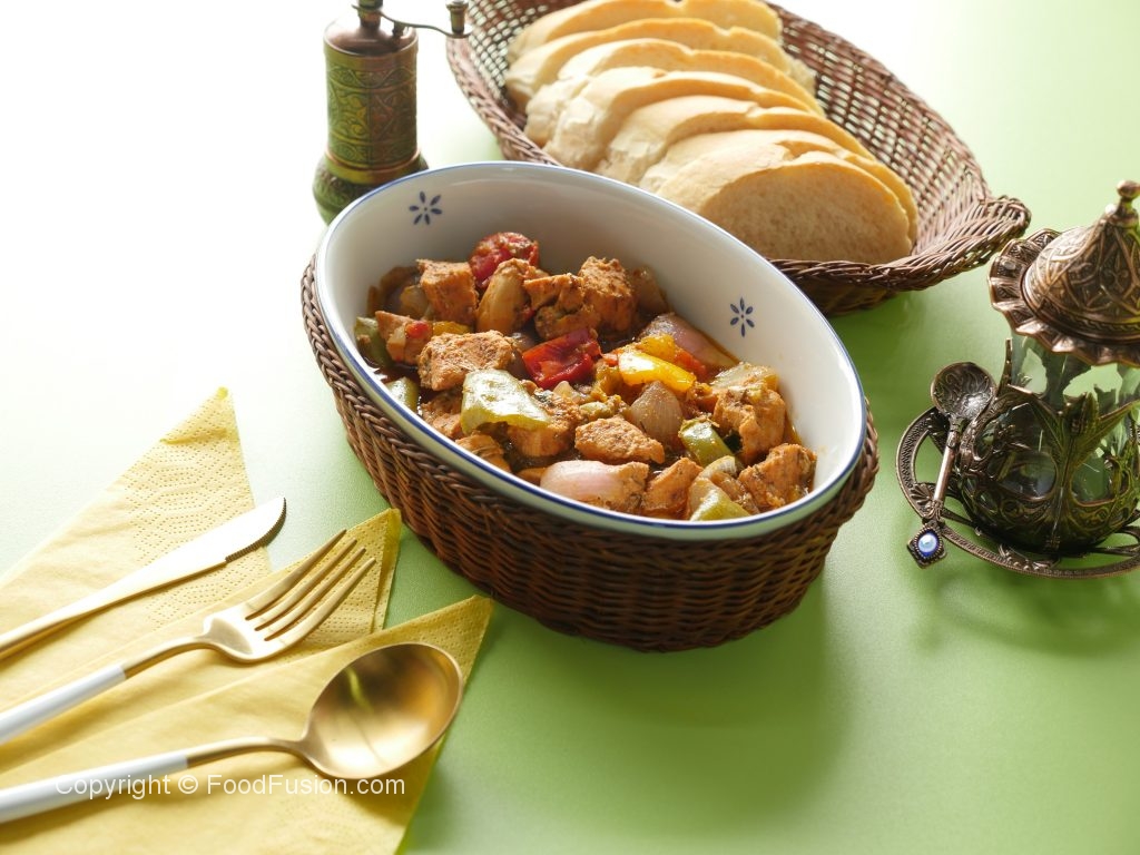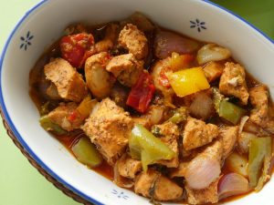 In bowl,add chicken boneless cubes,onion,colored bell pepper,garlic,green chilies,cumin seeds,paprika powder,dried thyme,black pepper crushed,salt,fresh basil leaves,tomato paste,sufi cooking oil and mix well.