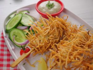 -Air fry in preheated air fryer at 200C, spray oil on thread chicken sticks & air fry for 10-12 minutes (flip in between).