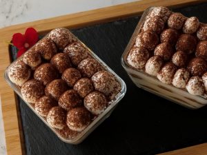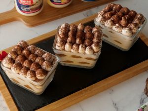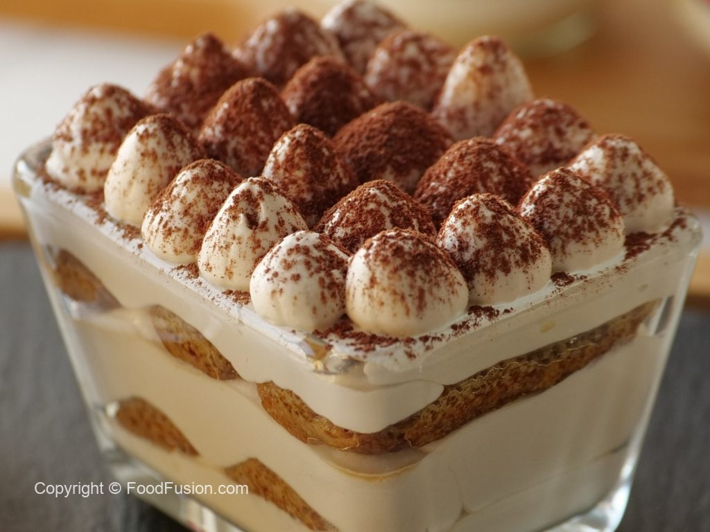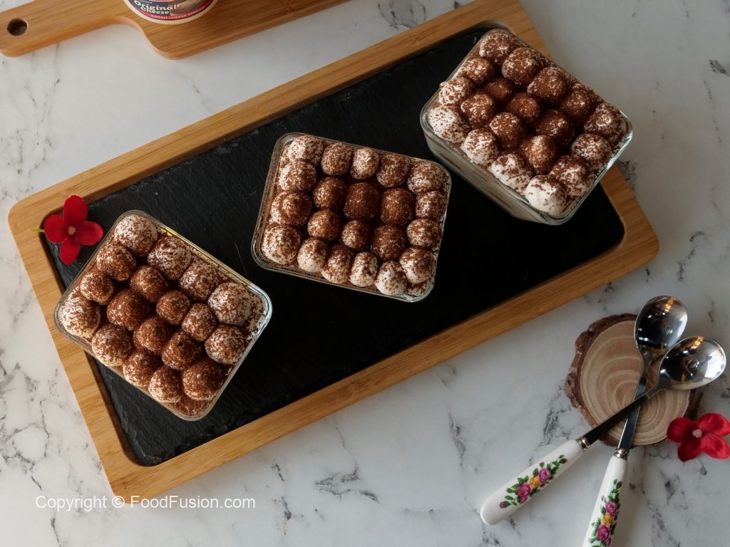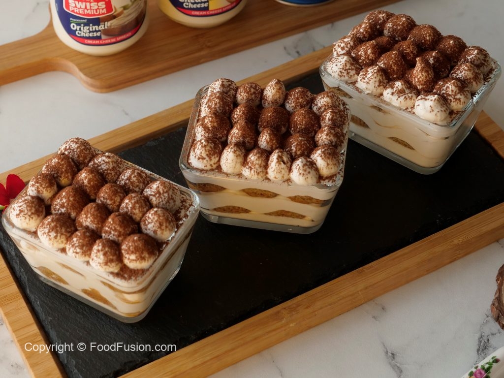 Serving cups mein tayyar cheese & cream mixture ki layer laga lein,coffee dipped biscuits ek ek ker ka rakh dein aur ek aur layer cheese & cream mixture ki laga lein aur cocoa powder sprinkle ker lein.