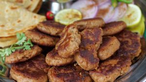 -In a large tray,add beef mince,chickpea flour,ground paste,raw papaya paste,pink salt,red chilli powder, garam masala powder,cardamom powder,mace powder,mix & knead well with the help of hands.