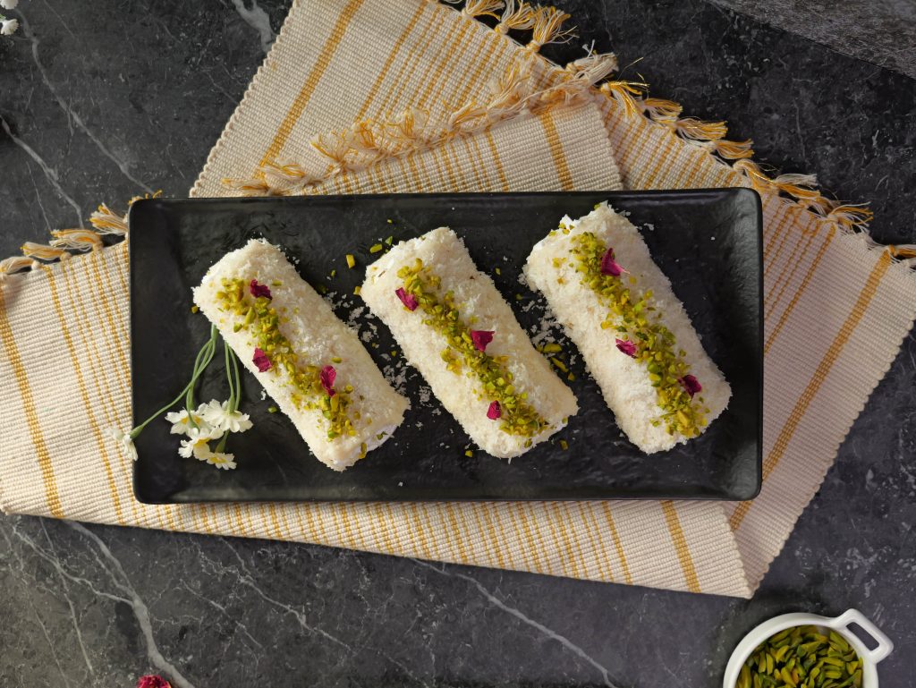 -Coconut layer par yeh mixture daal kar evenly spread karein (aadha inch layer).