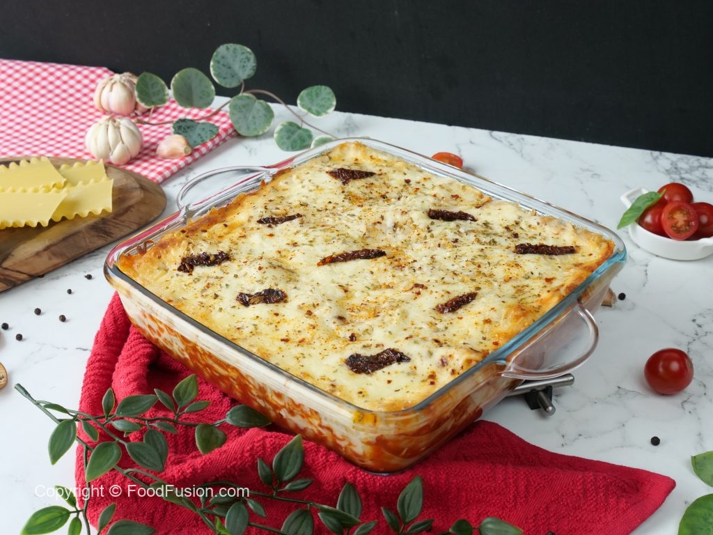 -Baking dish mein pizza sauce dal ker pheela lein,lasagna sheets,pizza sauce,tayyar tuscan chicken sauce,cheddar,cheese,mozzarella cheese,lasagna sheets,pizza sauce,tayyar tuscan chicken sauce, cheddar cheese,mozzarella cheese,lasagna sheets,pizza sauce,tayyar tuscan chicken sauce,cheddar cheese,mozzarella cheese,dried oregano,red chilli crushed & sundried tomatoes dal dein.