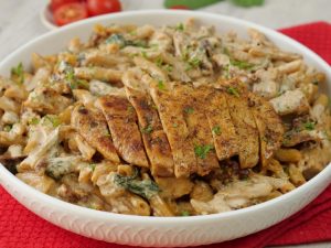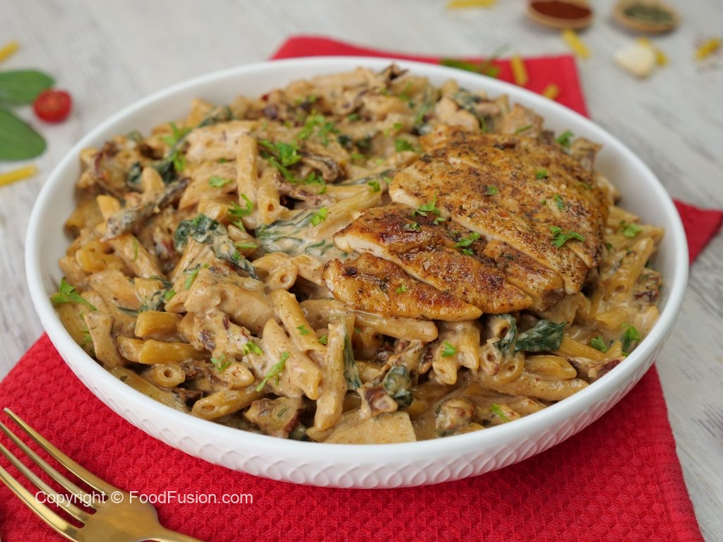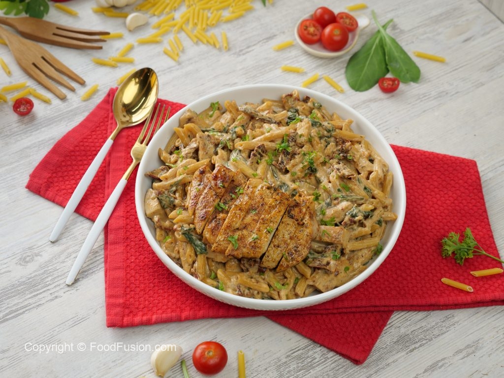 -Serving plate mein pasta aur cooked chicken slices dal dein aur fresh parsley garnish ker ka serve karein!