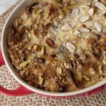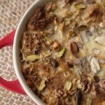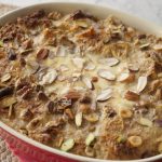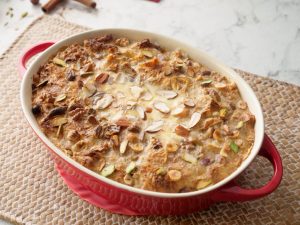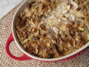 On baking dish,break puff pastry into pieces,sprinkle cinnamon powder,desiccated coconut,raisins, hazelnuts,walnuts,pistachios,prepared milk,topped with cream and sprinkle almonds.
