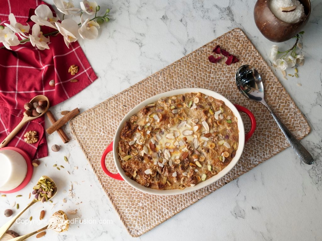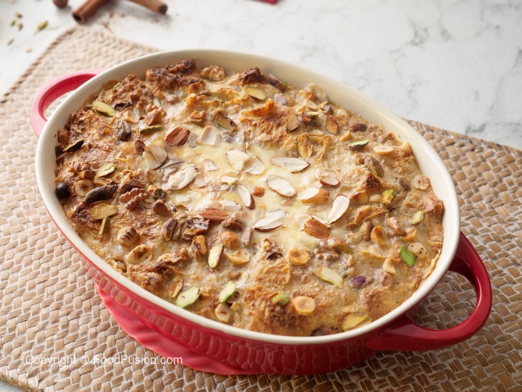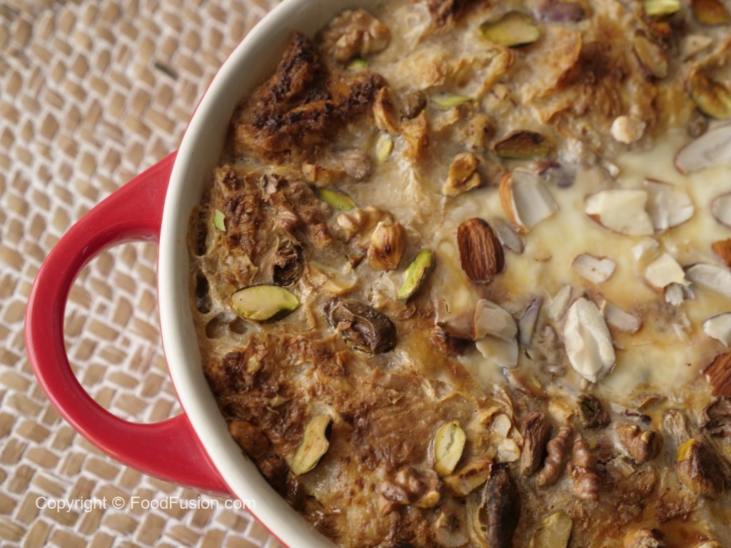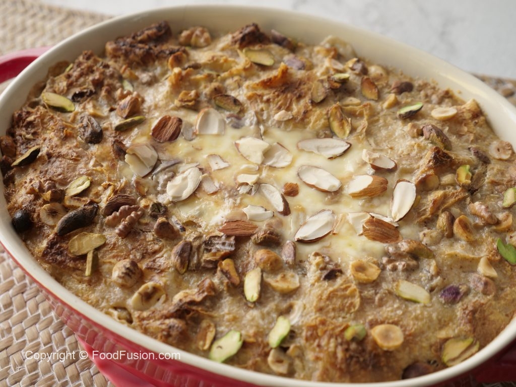Umm Ali a famous Egyptian dessert recipe from scratch. Tip: You can replace puff pastry with croissants or puff pastry biscuits (bakarkhani). #HappyCookingToYou #FoodFusion #OlpersCream