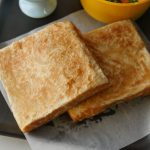 On working surface,sprinkle all-purpose flour,place plain paratha and cut into two halves.