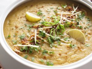 Dish out daleem & sprinkle fried onion, ginger, green chillies, fresh coriander, chaat masala,add lemon wedges & serve.