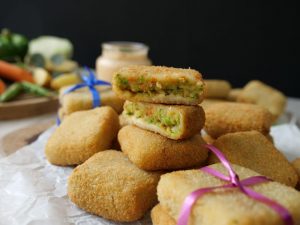 -Now dip vegetable nuggets in flour slurry & coat with breadcrumbs then again dip in flour slurry & coat with breadcrumbs (makes 28-10).
