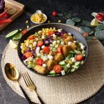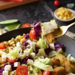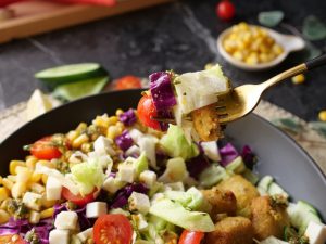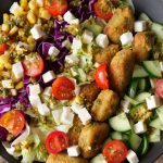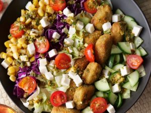 On a serving plate,add iceberg,purple cabbage,fried veggie nuggets,cucumber,corn kernels,cherry tomatoes,cottage cheese & drizzle prepared salad dressing & serve!