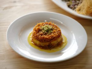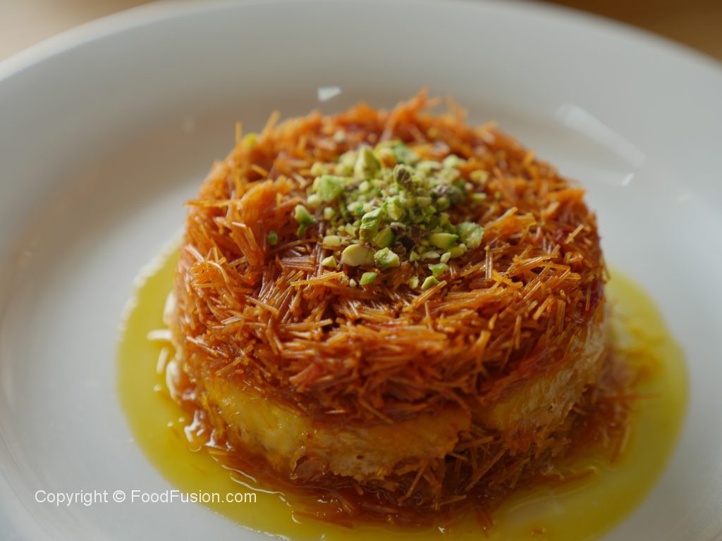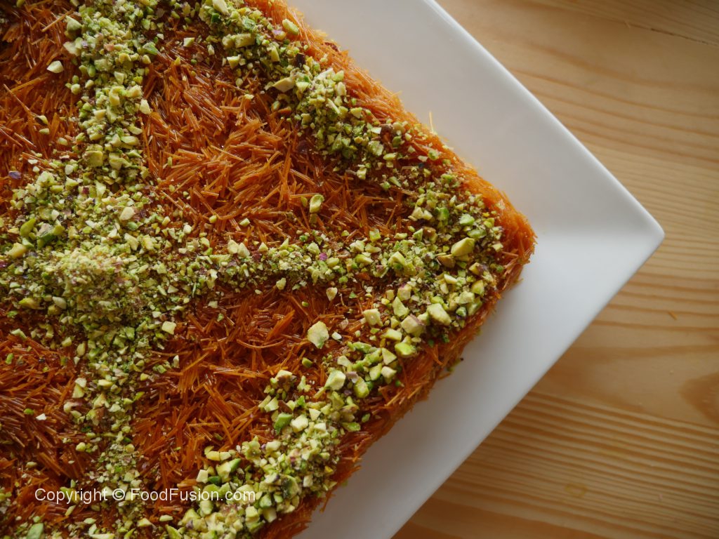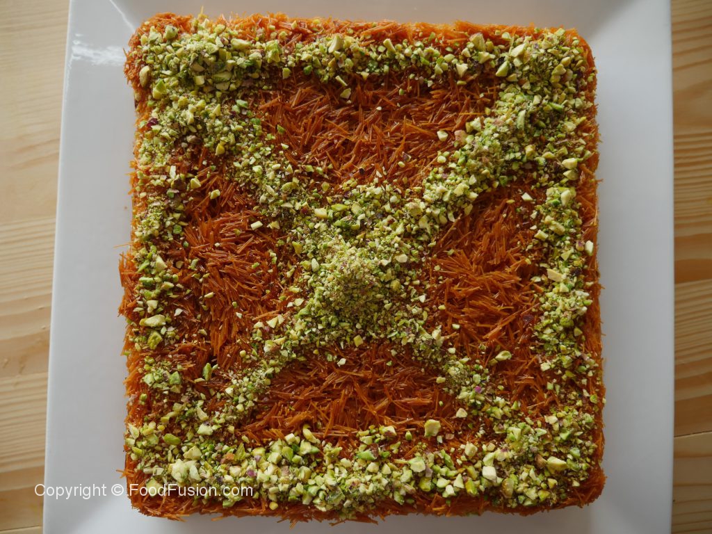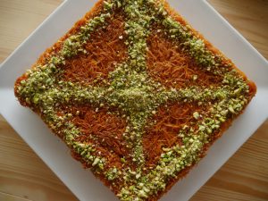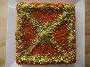 After baking,pour generously warm sugar syrup and garnish with pistachios.