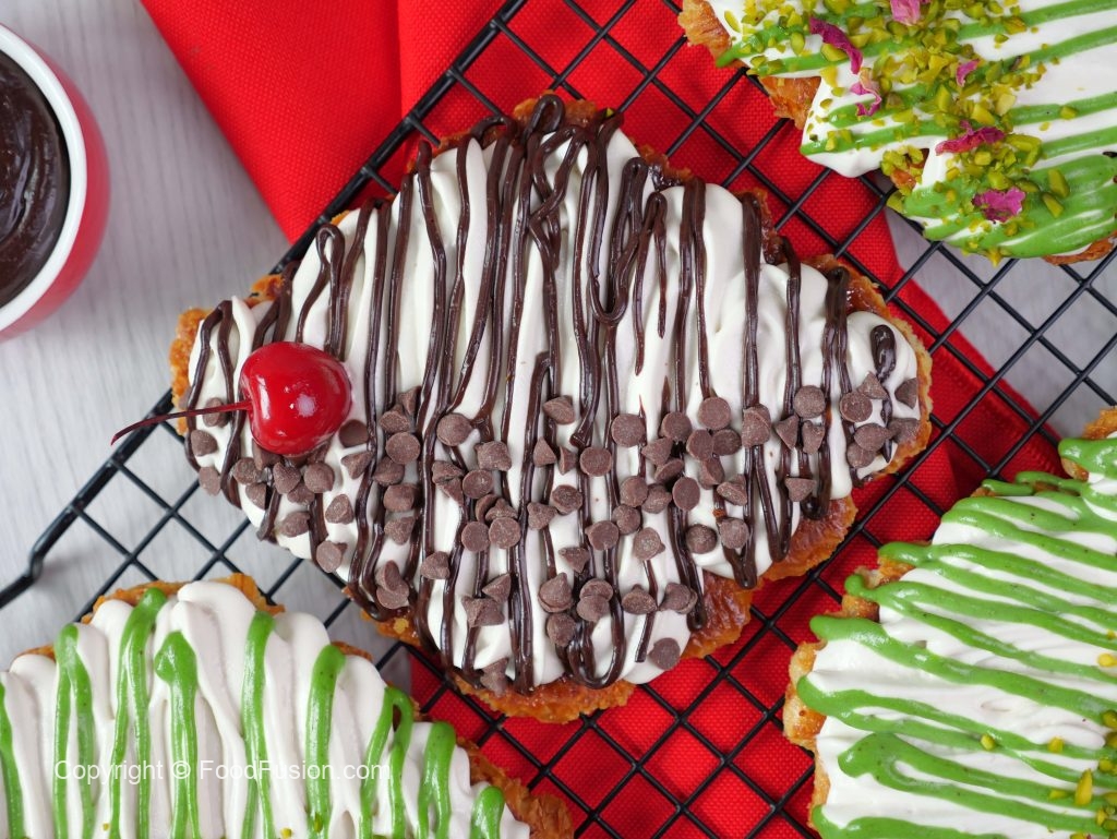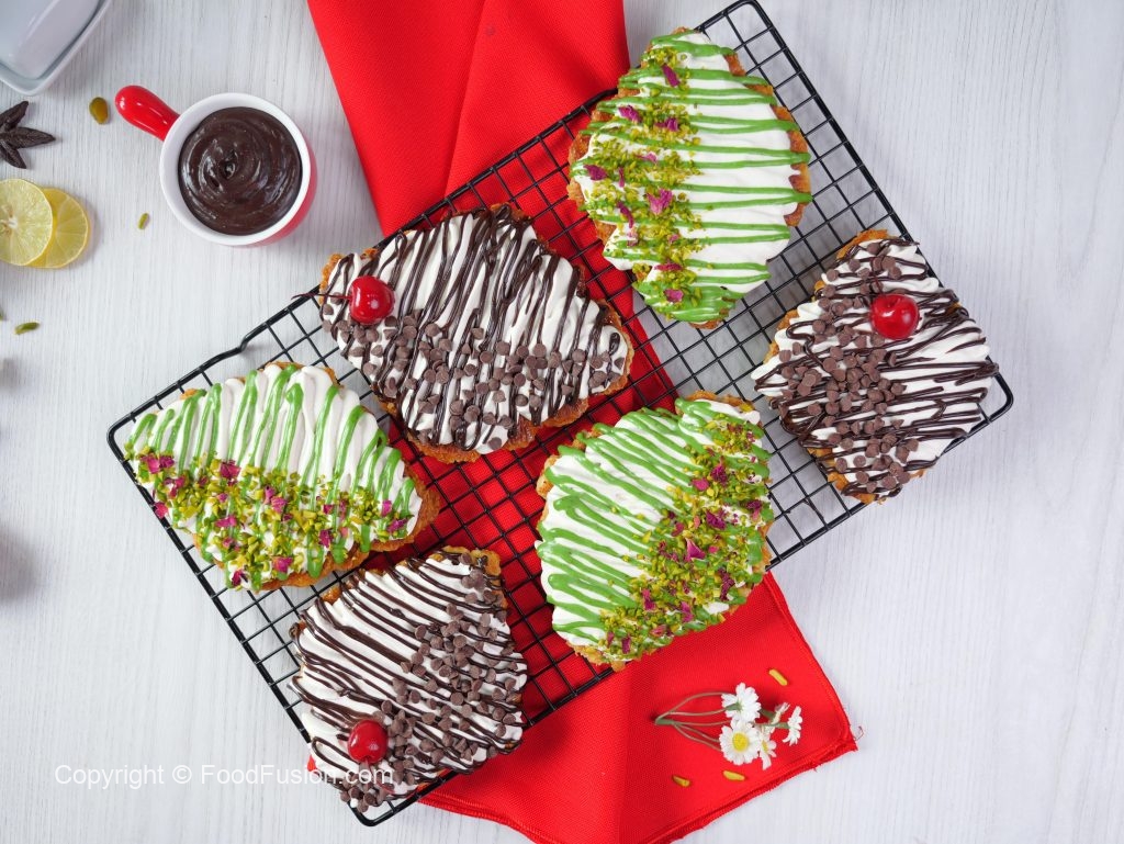 -Caramelized croissant par cream frosting spread karein,chocolate ganache lagayein,chocolate chips daalein aur cherry se garnish karein.