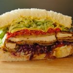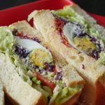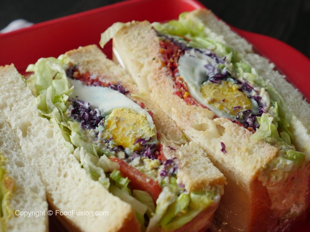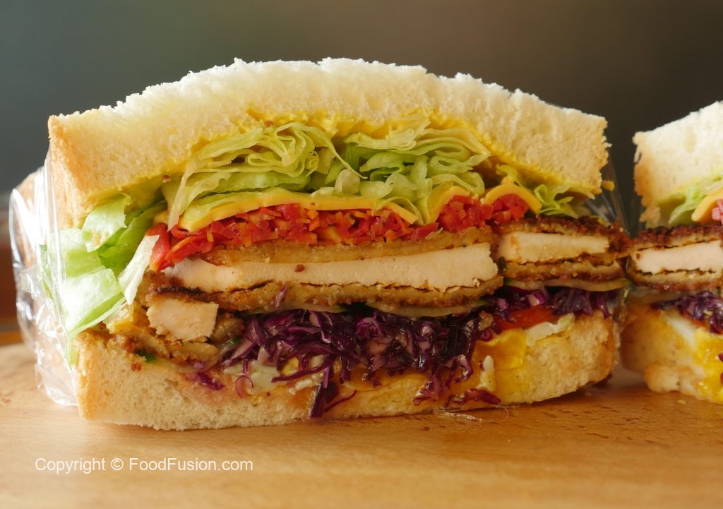 On cling film,place bread slices and apply mayo mustard spread,ice berg,cheese slice,carrots mixture, fried chicken pieces,Bbq sauce,cucumber slices,purple cabbage mixture,tomato slices,fried egg and top with another slice,wrap in cling film then cut into two pieces & serve!