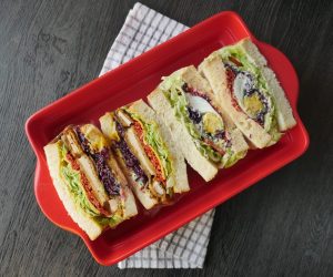 On cling film,place bread slices,spread cream cheese,ice berg,tomato slices,cucumber,egg & chicken mixture,purple cabbage mixture,boiled egg,carrot mixture and top with another slice,wrap in cling film then cut into two pieces & serve!