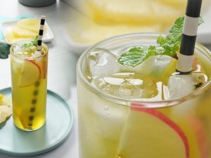 In a pitcher,add melon balls,watermelon balls,honeydew melon balls,prepared juice,7up,mint leaves,stir & serve!