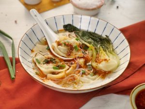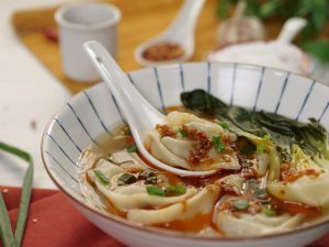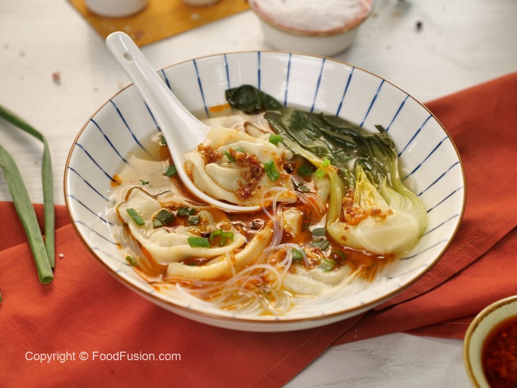 -In a bowl,add glass noodles,prepared wonton soup,bok choy,chilli oil,spring onion leaves & serve!